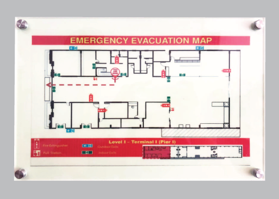 The Evacuation Plan is manufactured using rigid photoluminescent PVC sheet with a clear acrylic overlay and metal stand-off fixers.