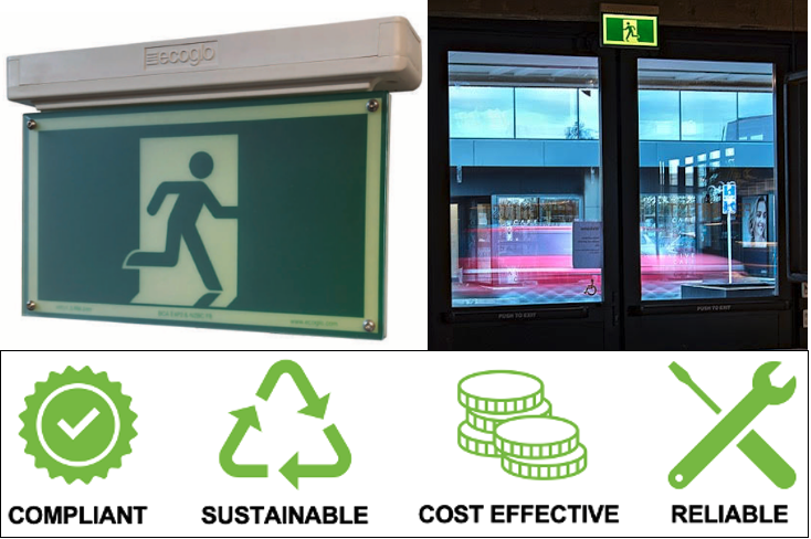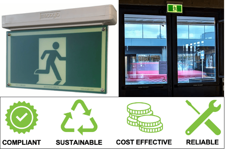 Ecoglo’s self-charging LED exit sign replaces batteries with our highly efficient Energy Caching Panel (ECP) and next generation electronics to produce a more sustainable, durable and cost-effective exit sign. The Self Charging LED Exit Sign now has a 15 year warranty so it makes real cost savings and offers a more sustainable option – lower electricity usage and no batteries.